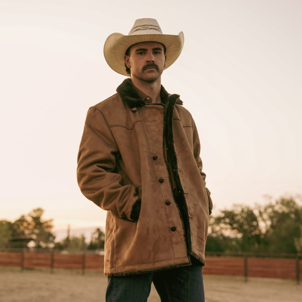 Unique Tempco Mens Marlboro Sherpa Coat. This Marlboro suede coat is inspired in vintage Western style and detailing that makes it one of a kind. Folded shearling effect and lied waist pockets with an aviator style collar and soft shearling lining. This faux shearling coat features a front zipper, snap buttons, a western style yoke on the front and back and Tempco logo on front left bottom.