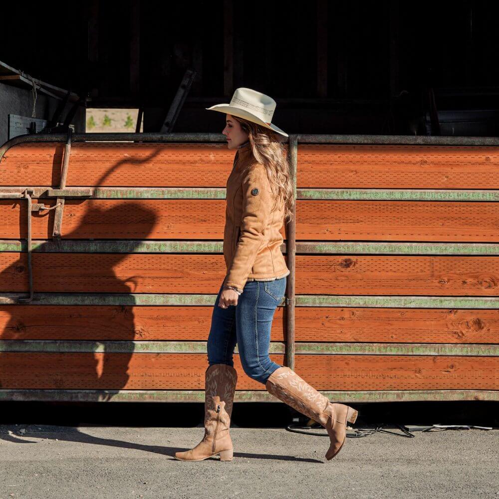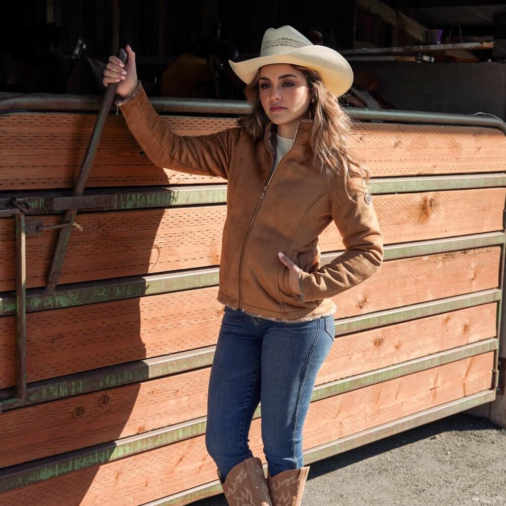 Beautiful Tempco Womens Olivia Jacket. This stylish womens faux suede jacket has a cozy yet stylish faux shearling lining so you'll stay warm in cold weather for a Nashville night out on the town. This jacket is versatile to wear with any outfit for your favorite winter look. Embellished with matching accents including zipper and logo on arm.