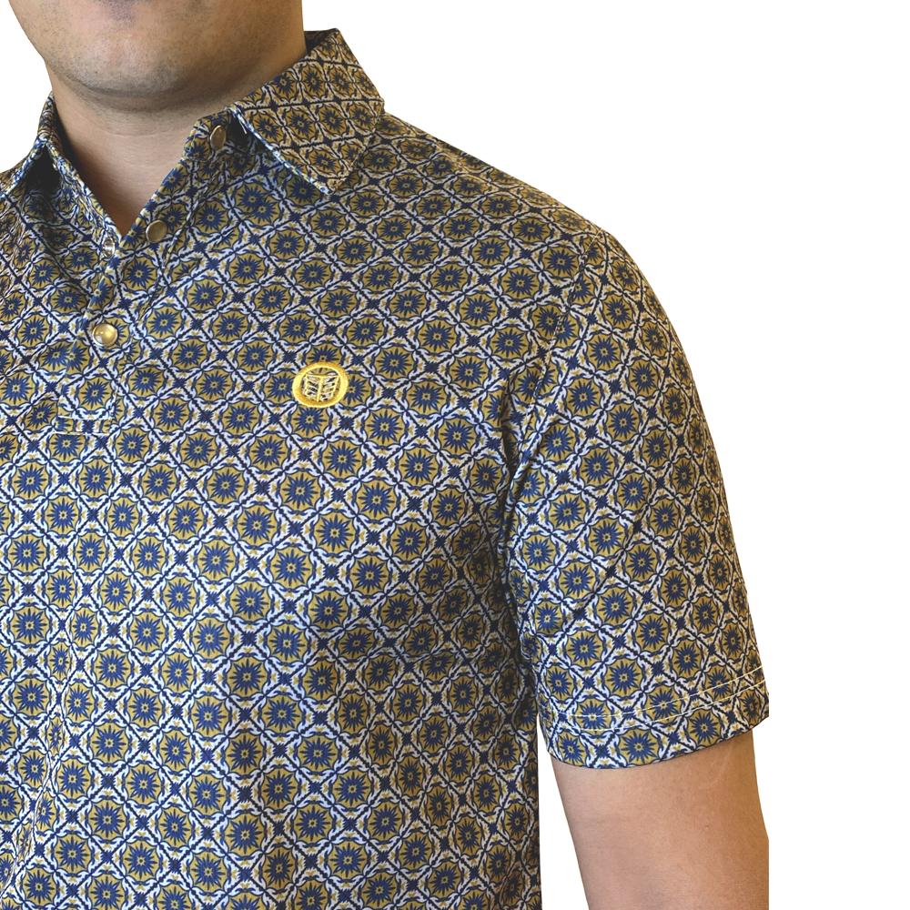 This mens short-sleeve polo delivers a sharp Western-inspired look with everyday comfort. Designed in a Grey & Gold tone, it features a bold woven geometric pattern. The classic three-button placket and structured collar provide a polished finish, while the soft, breathable fabric makes it ideal for all-day wear.