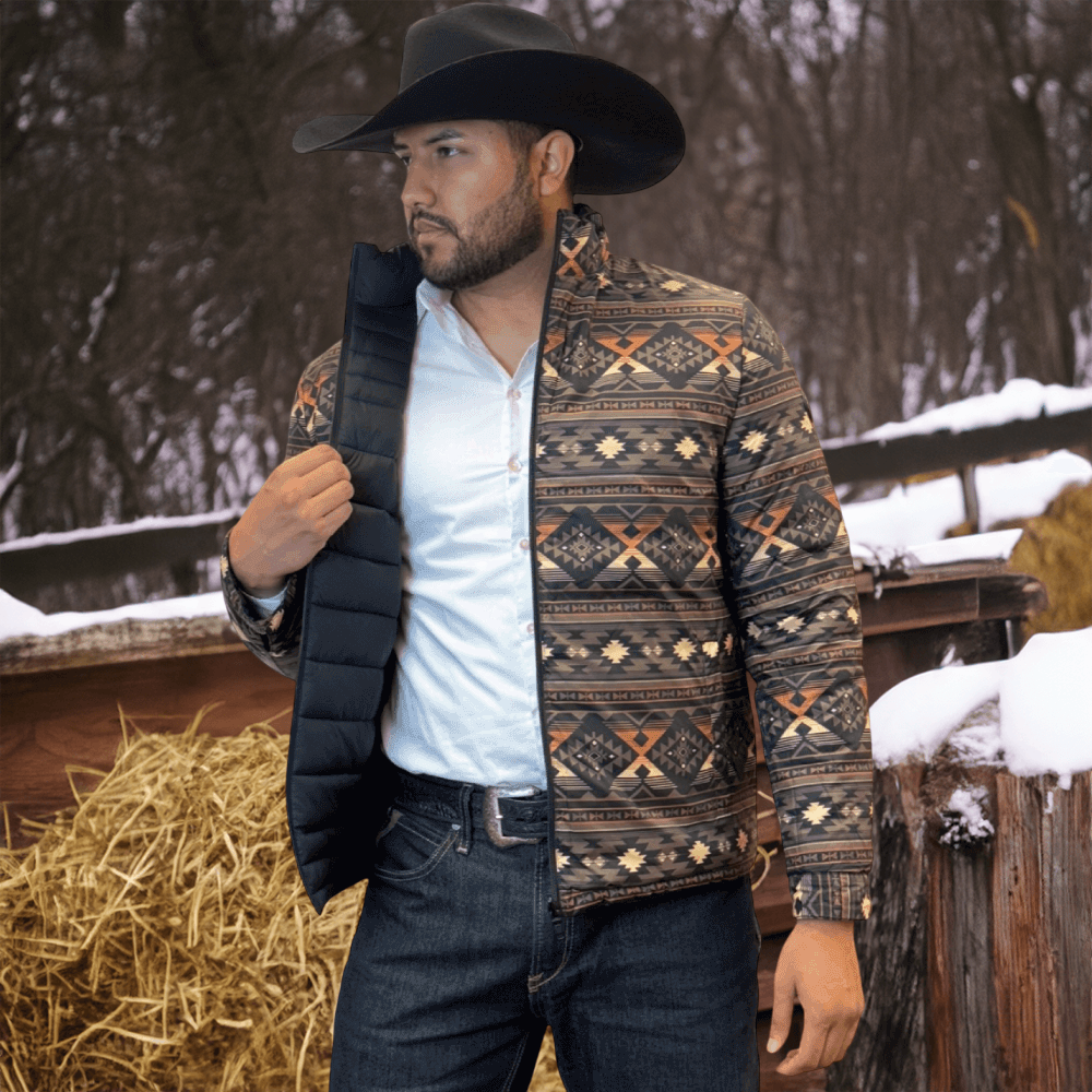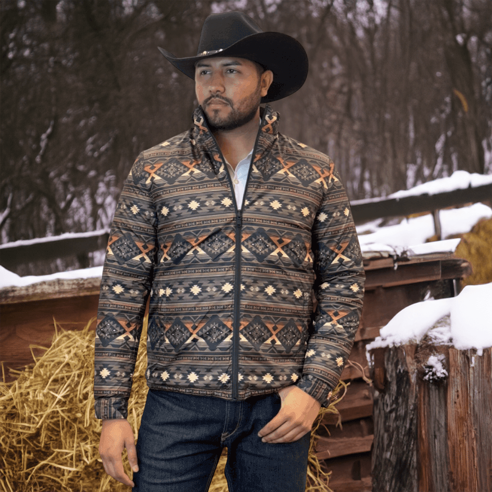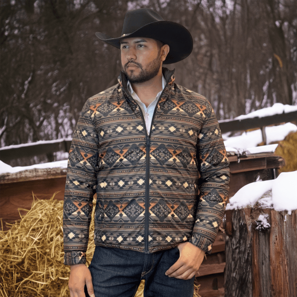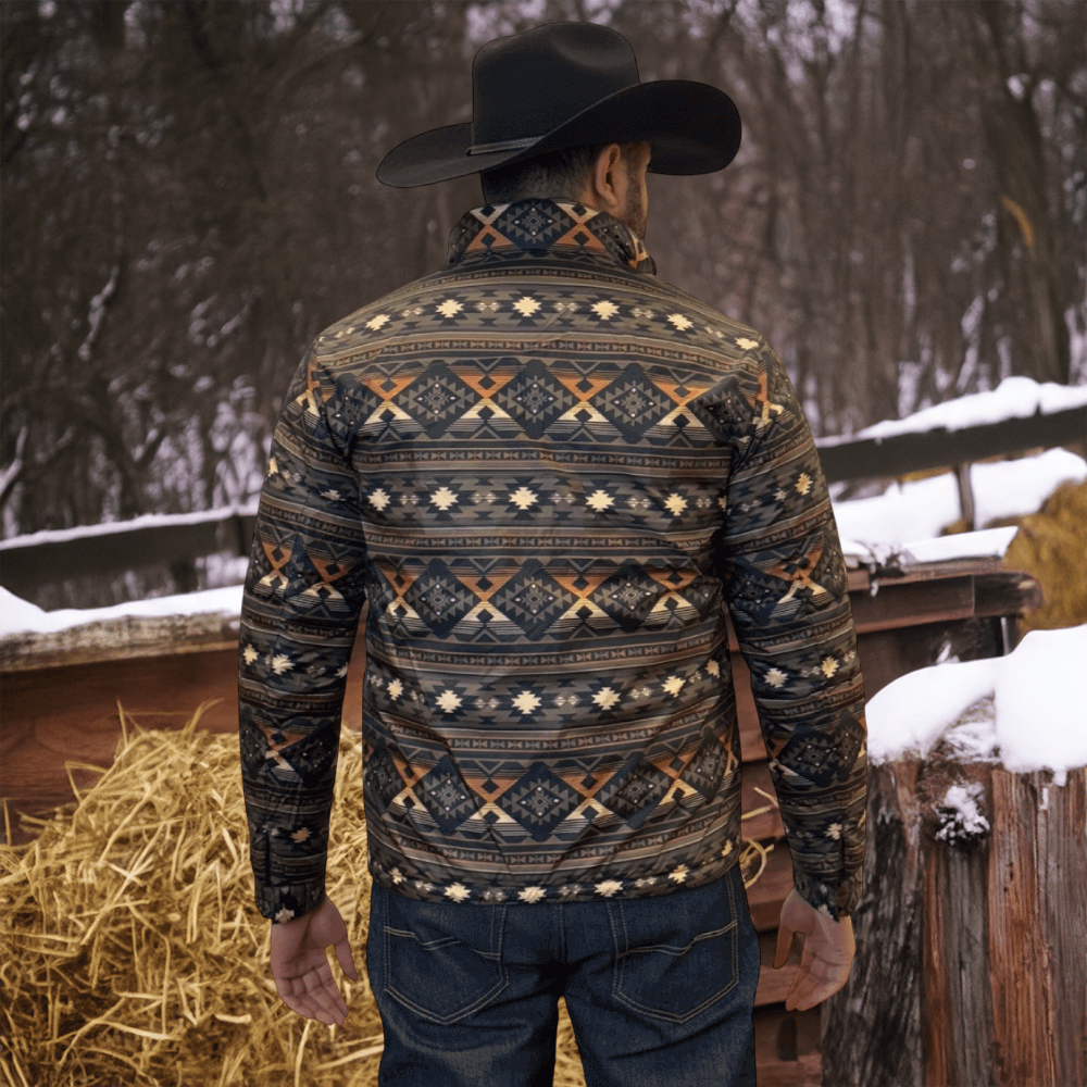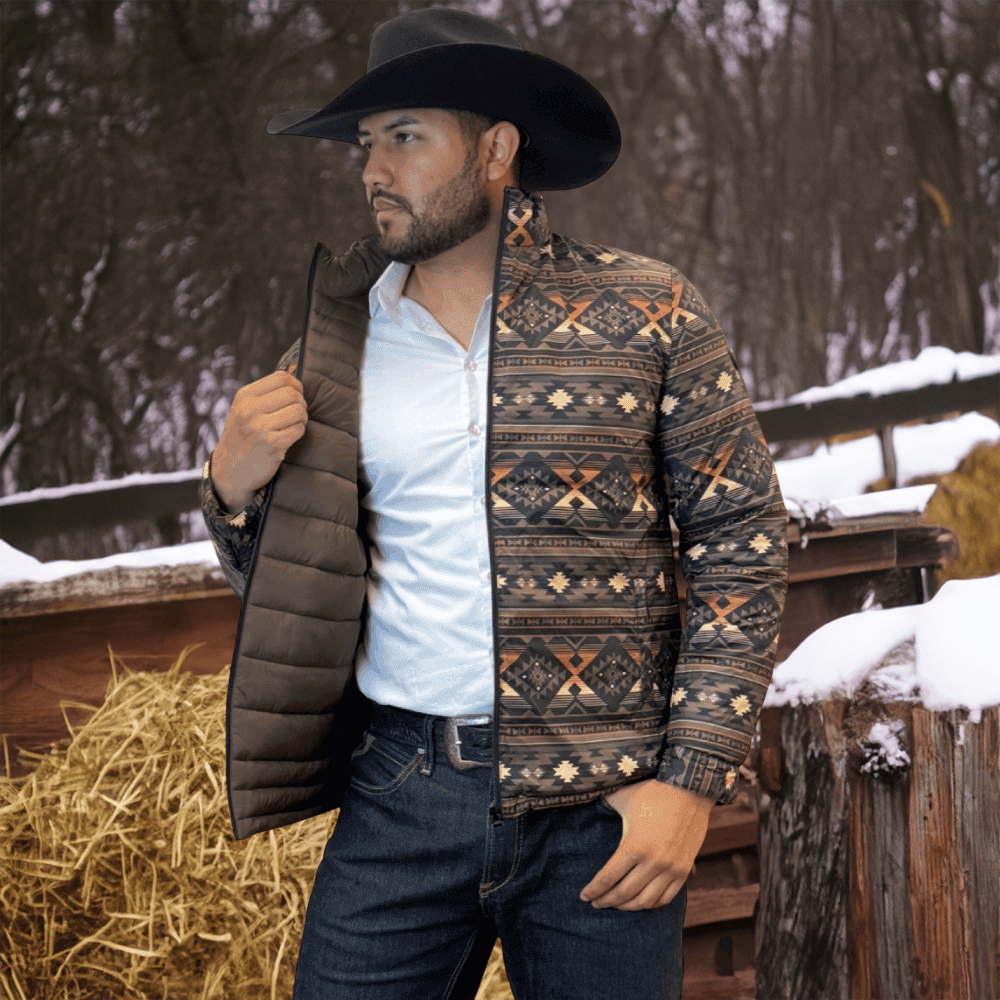 The soft feel of a lightweight Western puffer jacket with a more durable construction, plus it’s reversible! Two great styles in one with this stylish reversible jacket with printed Aztec pattern on the inside! Warm and comfy WarmTek Eco down filling. You won’t have to worry about harsh weather conditions like cold wind and rain, when you have this jacket on, it helps you keep the elements out