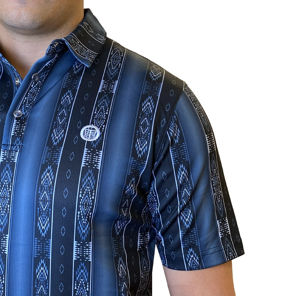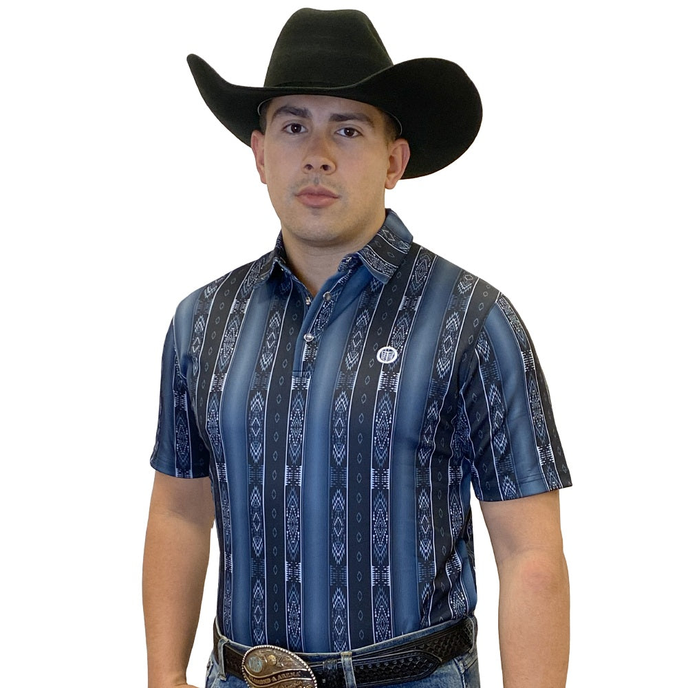 This mens short-sleeve polo delivers a sharp Western-inspired look with everyday comfort. Designed in a Striped Navy Aztec tone, it features a bold woven geometric pattern across the chest and sleeves in contrasting blue for standout style. The classic three-button placket and structured collar provide a polished finish, while the soft, breathable fabric makes it ideal for all-day wear.